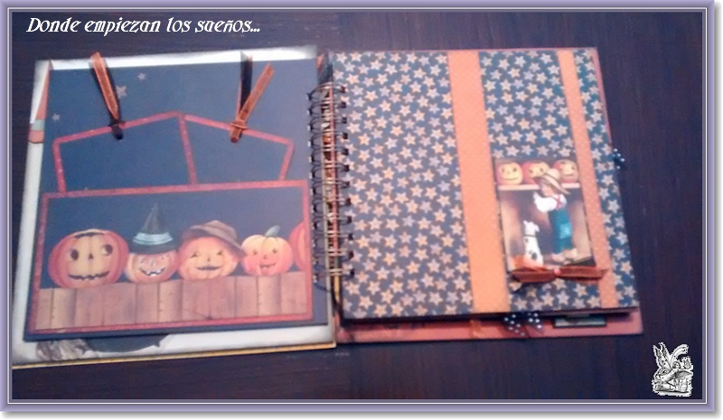 Hasta aquí el álbum, una vez tenga las fotos y sepa como las voy a colocar lo remataré. He pensado guardar algunos restos de los papeles que usamos para esos últimos detalles y supongo que con lo restante haré alguna etiqueta de adorno para ponerla en casa en esas fechas... No es que me guste Halloween como fiesta, de hecho no lo celebro, pero las calabazas, los gatos negros y las brujas me encantan y en otoño no me puedo resistir a poner calabazas como adorno.